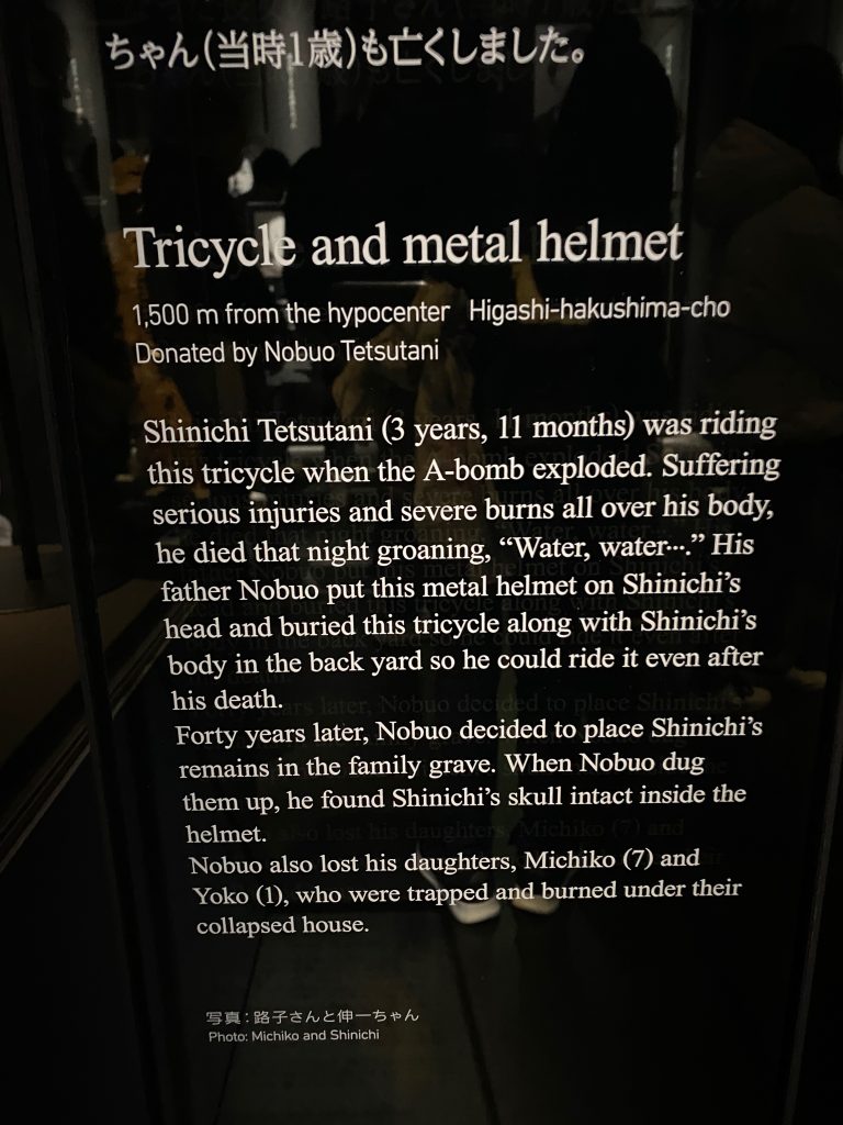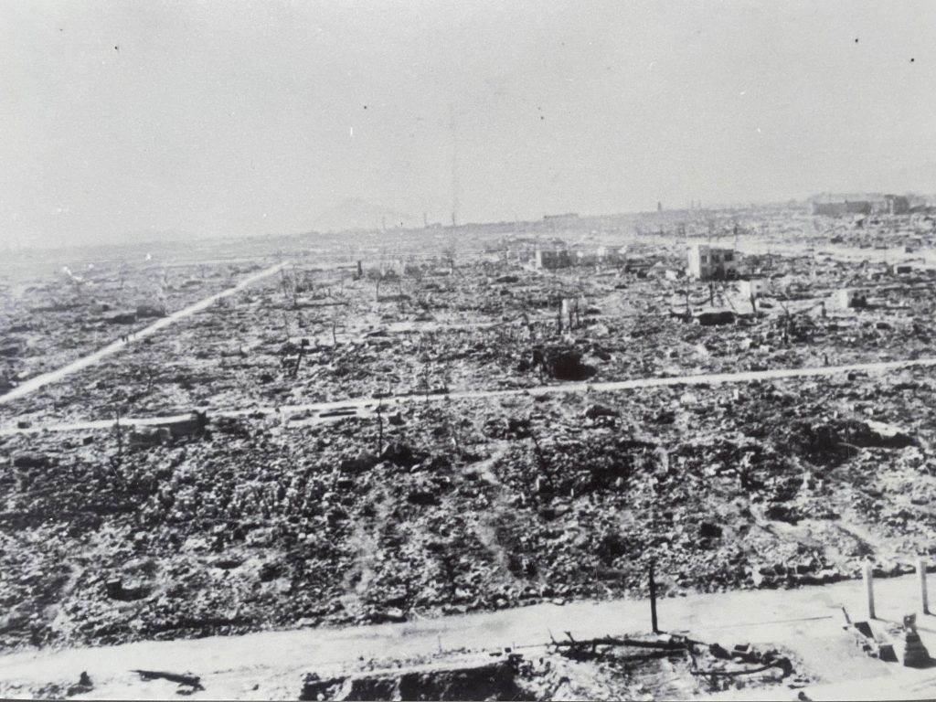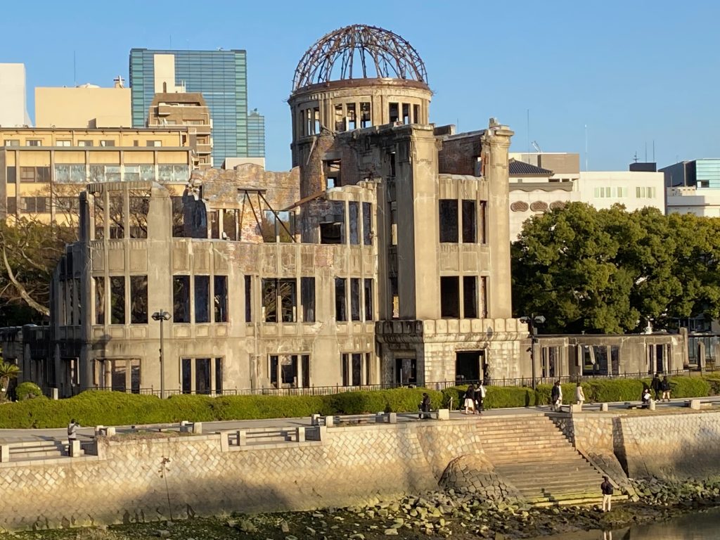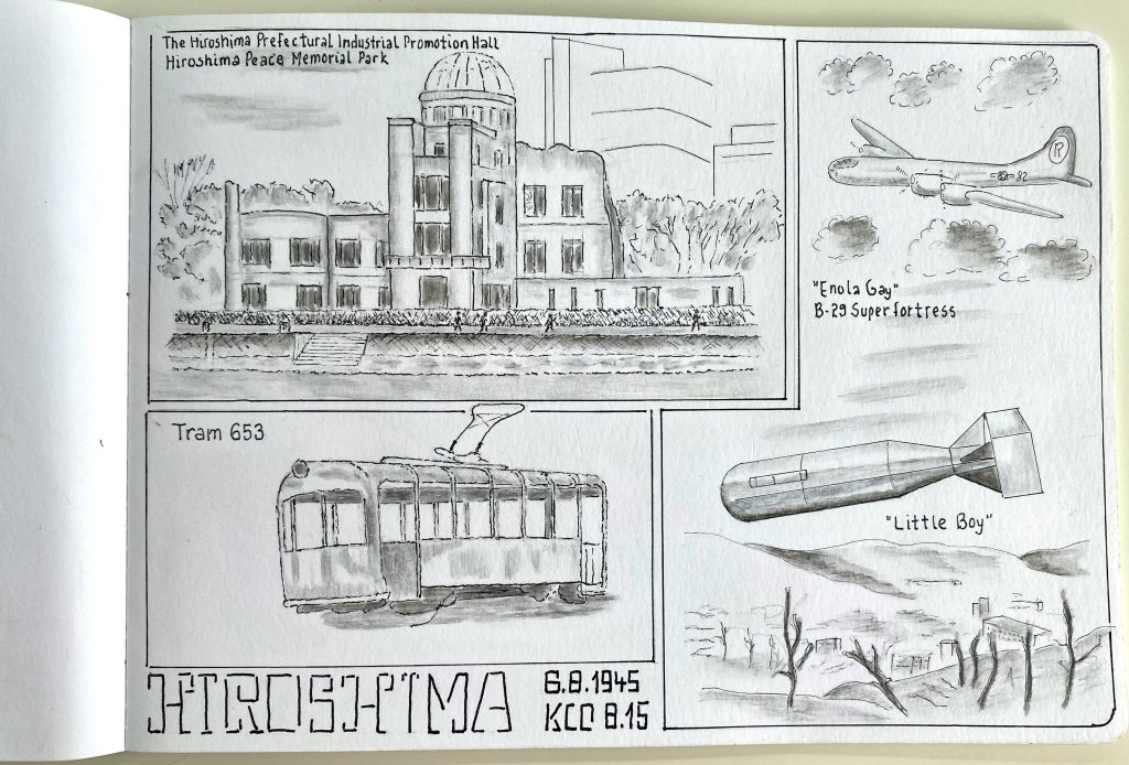 Kohtalon hetki kaupungin historiassa: maanantai 6.8.1945 kello 8:15. Enola Gay niminen ”lentävä linnoitus” pudotti atomipommin keskelle kaupunkia. Tähdättiin sillalle, jossa joki haarautuu kolmeen juoksuun, mutta pommi räjähti satametriä kauempana 550 metrin korkeudessa. Varsinainen amerikkalaisten ”taivaanlahja” aamutoimiaan ja töitään aloittaneille aikuisille, lapsille ja vanhuksille. Noin 140 000 ihmistä sai surmansa.