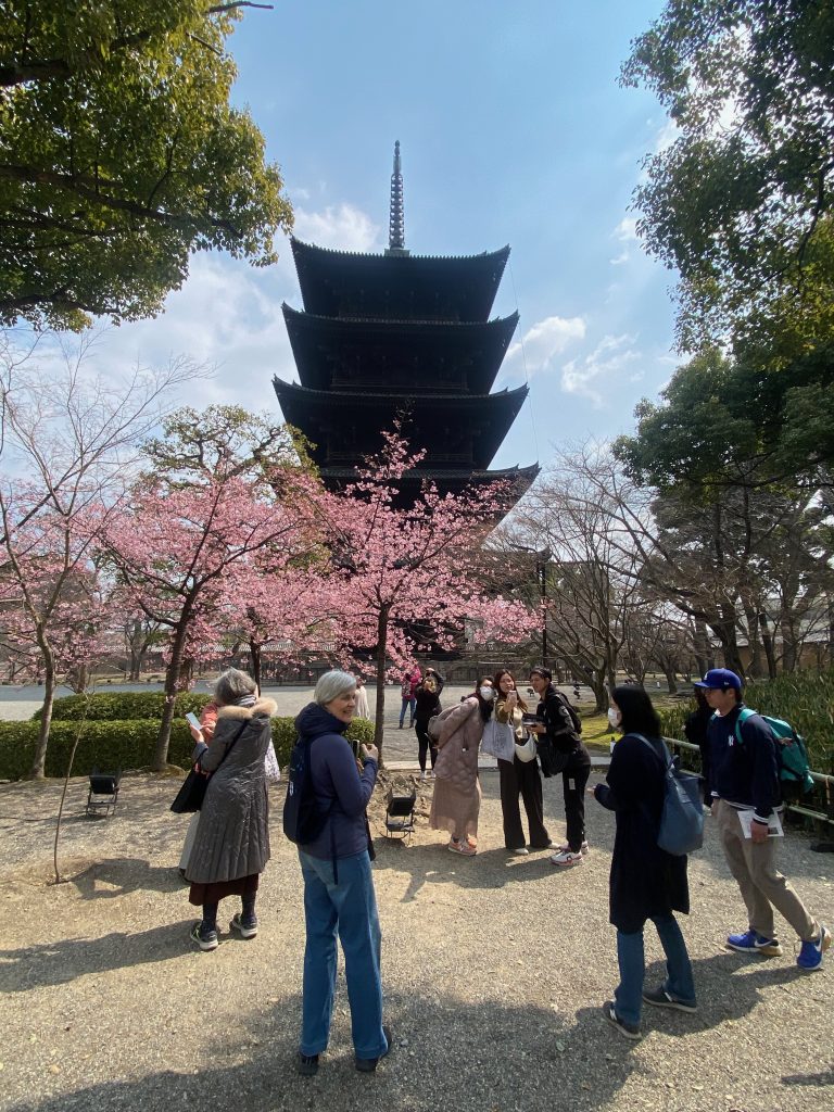 Kiotossa päivät kuluivat verkkaisesti. Hotellin lähellä oli mahtava Tojin-temppeli, ja sen alueelle suuntasimme heti perjantaina. Ikävä kyllä valtavia Budhan patsaita ei saanut kuvat tai edes piirtää, ne olivat pyhiä ja tunnelma niitä katsellessa harras. Kirsikkapuut alkoivat vähitellen kukkia, kun ilmakin lämpeni päivä päivältä – olimme päässeet eroon yöpakkasista ja lämpötila kohosi päivisin yli 20 asteen!